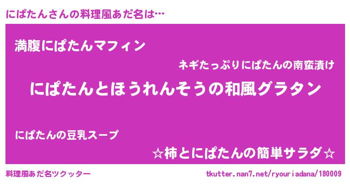 | 意味不明あだ名 | 『なめこ科にぱたん属』『自称にぱたん』 |