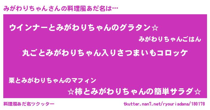 | 意味不明あだ名 | 『住所不定無職みがわりちゃん(6歳)』 |