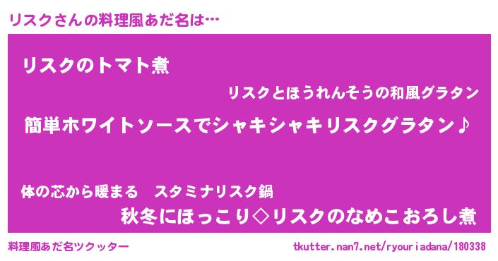 | 男性向けラノベタイトル風あだ名 | 『リスクの嫁は女の子じゃないと思った?』 |