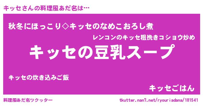 | 胡散臭い通販商品みたいなあだ名 | 『信頼と実績のサプリメント…その名も「キッセ」』 |