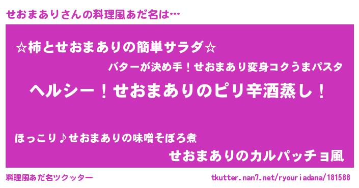 | 男性向けラノベタイトル風あだ名 | 『Re:せおまありから始める異世界生活』 |