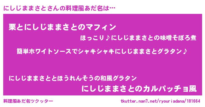 | 男性向けラノベタイトル風あだ名 | 『にしじままさとの嫁は女の子じゃないと思った?』 |