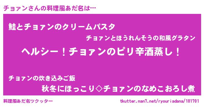 | 男性向けラノベタイトル風あだ名 | 『Re:チョァンから始める異世界生活』 |