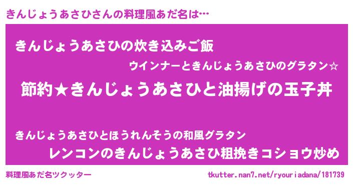 | 男性向けラノベタイトル風あだ名 | 『キンジョウアサヒアートオンライン』 |