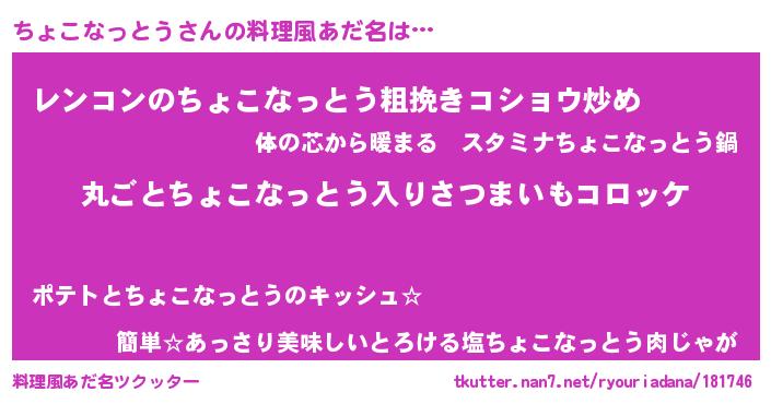 | 男性向けラノベタイトル風あだ名 | 『この素晴らしい世界にちょこなっとうを!』 |