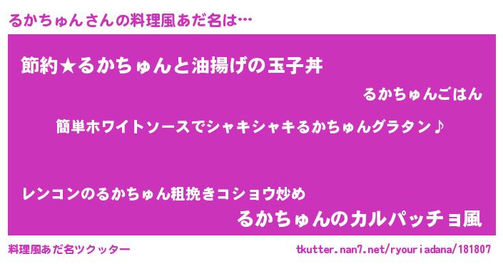 | 男性向けラノベタイトル風あだ名 | 『るかちゅんの嫁は女の子じゃないと思った?』 |