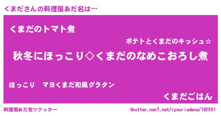 | 男性向けラノベタイトル風あだ名 | 『くまだに滅ぼされるだけの簡単なお仕事です』 |
