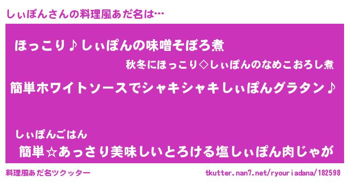 | 男性向けラノベタイトル風あだ名 | 『しぃぽんの嫁は女の子じゃないと思った?』 |