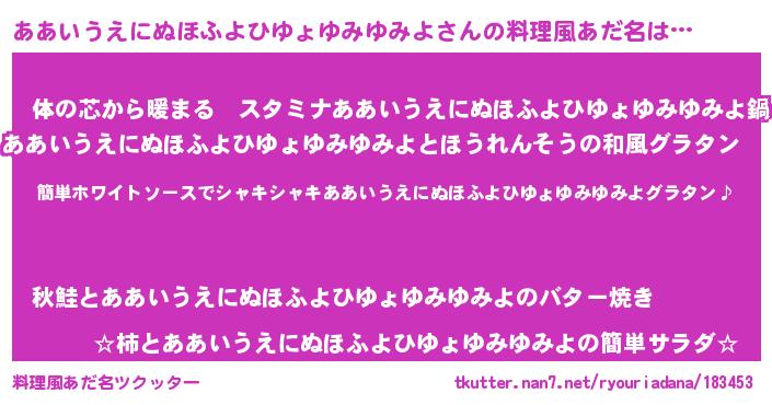 | 男性向けラノベタイトル風あだ名 | 『ああいうえにぬほふよひゆょゆみゆみよの嫁は女の子じゃないと思った?』 |