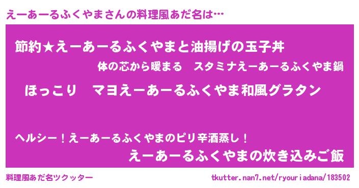 | 女子向けラノベタイトル風あだ名 | 『悪役えーあーるふくやまに転生したようですが、知った事ではありません』 |