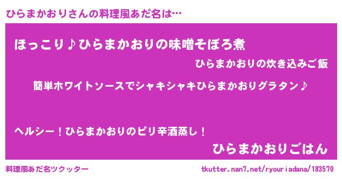| 男性向けラノベタイトル風あだ名 | 『ひらまかおりの嫁は女の子じゃないと思った?』 |
