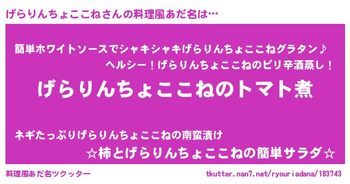 | 男性向けラノベタイトル風あだ名 | 『おまえをオタクにしてやるから、俺をげらりんちょここねにしてくれ! 』 |