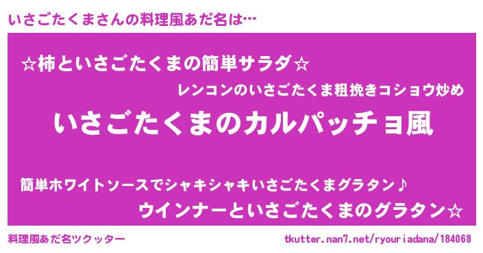 | 女子向けラノベタイトル風あだ名 | 『いさごたくまが死なない童話 林檎のいさごたくまの診療簿』 |