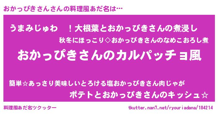 | 女子向けラノベタイトル風あだ名 | 『おかっぴきさんが死なない童話 林檎のおかっぴきさんの診療簿』 |