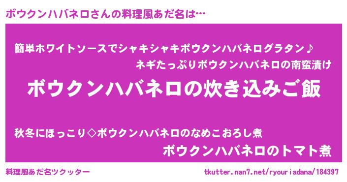 | 男性向けラノベタイトル風あだ名 | 『冴えないボウクンハバネロの育てかた』 |