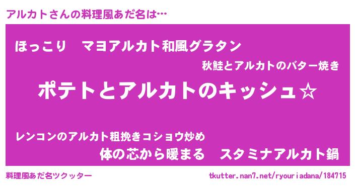 | 女子向けラノベタイトル風あだ名 | 『アルカトの卵を拾いまして』 |