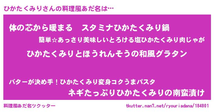 | 男性向けラノベタイトル風あだ名 | 『ひかたくみり~年齢イコール彼女いない歴の魔法使い~』 |