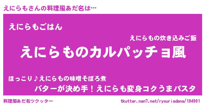 | 男性向けラノベタイトル風あだ名 | 『魔弾の王とえにらも』『えにらもの憂鬱』 |