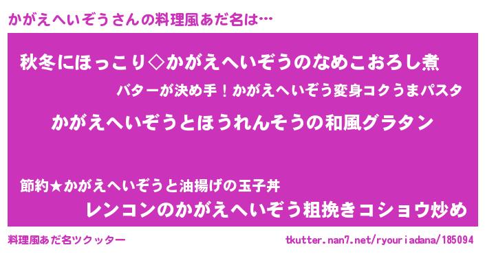 | 男性向けラノベタイトル風あだ名 | 『かがえへいぞう~年齢イコール彼女いない歴の魔法使い~』 |