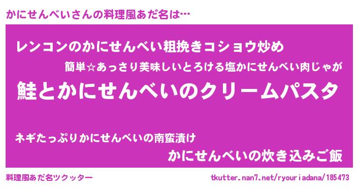 | 男性向けラノベタイトル風あだ名 | 『ノーゲーム・ノーカニセンベイ』 |