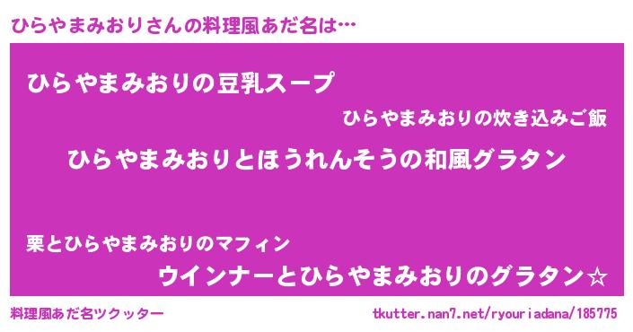 | 男性向けラノベタイトル風あだ名 | 『ひらやまみおり~年齢イコール彼女いない歴の魔法使い~』 |