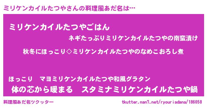 | 男性向けラノベタイトル風あだ名 | 『ミリケンカイルたつやに滅ぼされるだけの簡単なお仕事です』 |