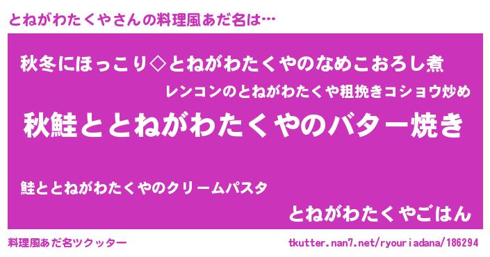 | 胡散臭い通販商品みたいなあだ名 | 『来世でも幸せになれる健康食品…その名も「とねがわたくや」』 |