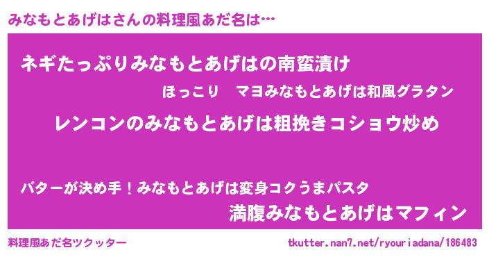 | ヘコむあだ名 | 『みなにゅー』『みなもとあげは(遠い目)』 |