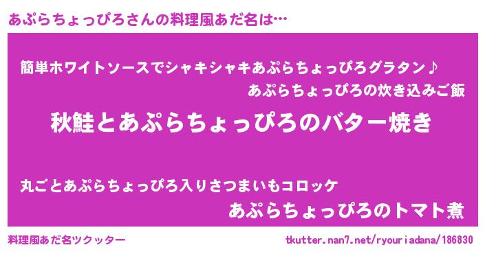 | ヘコむあだ名 | 『あぷらちょっぴろ(遠い目)』『あぷっぺ』 |
