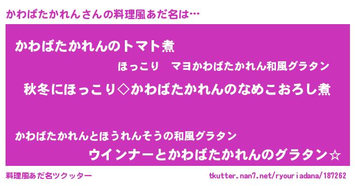 | 男性向けラノベタイトル風あだ名 | 『かわばたかれんに滅ぼされるだけの簡単なお仕事です』 |
