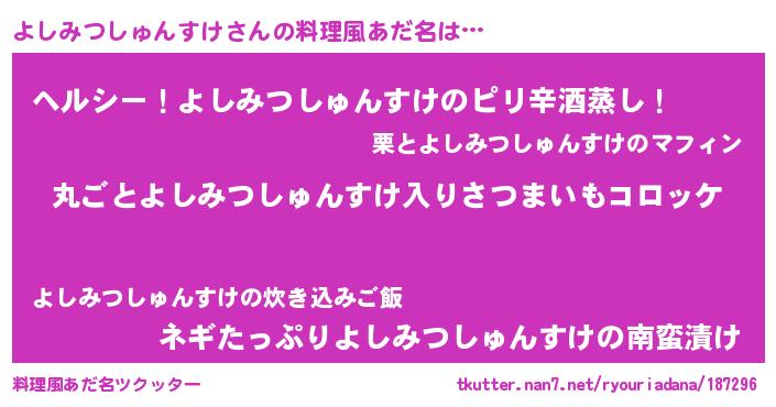 | 意味不明あだ名 | 『住所不定無職よしみつしゅんすけ(41歳)』 |