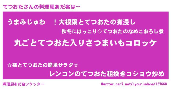 | 男性向けラノベタイトル風あだ名 | 『魔弾の王とてつおた』『緋弾のテツオタ』 |
