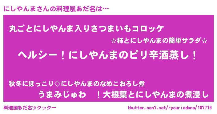 | 男性向けラノベタイトル風あだ名 | 『Re:にしやんまから始める異世界生活』 |