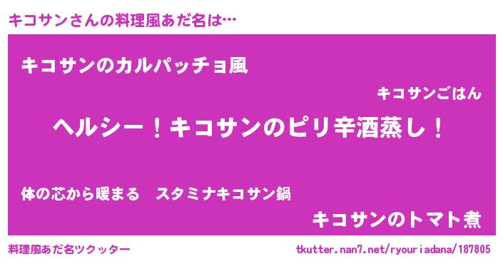 | 男性向けラノベタイトル風あだ名 | 『Re:キコサンから始める異世界生活』 |