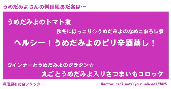 | 男性向けラノベタイトル風あだ名 | 『Re:うめだみよから始める異世界生活』 |