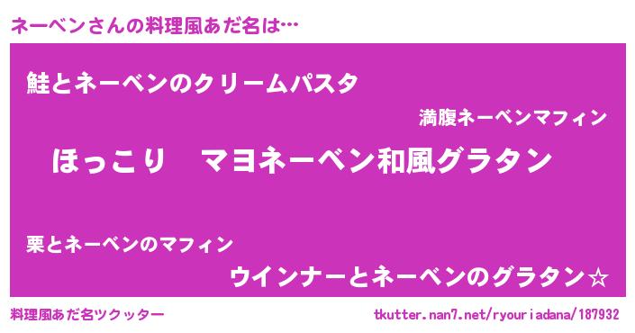 | 男性向けラノベタイトル風あだ名 | 『この素晴らしい世界にネーベンを!』 |
