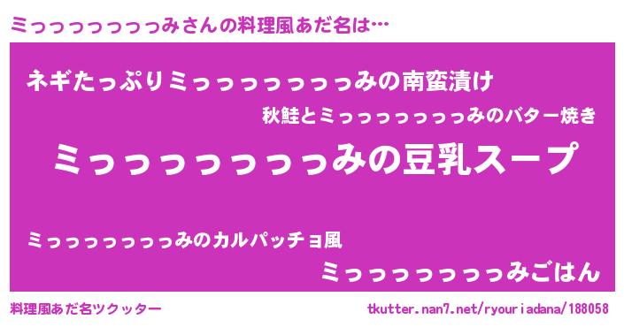 | 胡散臭い通販商品みたいなあだ名 | 『信頼と実績のサプリメント…その名も「ミっっっっっっっみ」』 |