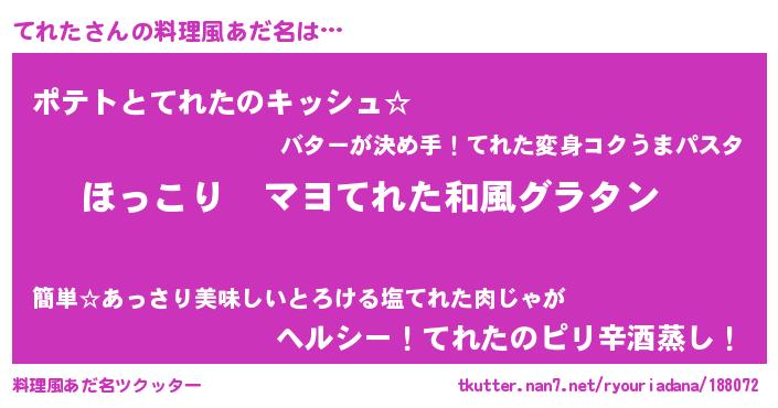 | 意味不明あだ名 | 『住所不定無職てれた(95歳)』『自称てれた』 |