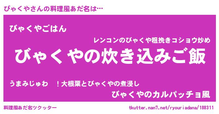 | 胡散臭い通販商品みたいなあだ名 | 『あなたにだけ特別に提供する世界で10本だけ現存している希少なブランデー…その名も「びゃくや」』 |