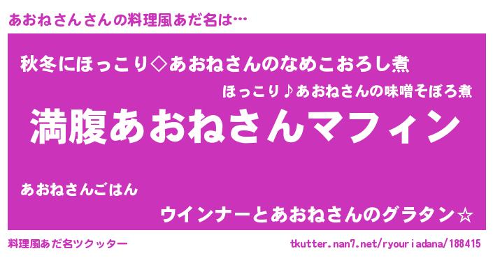 | 女子向けラノベタイトル風あだ名 | 『異世界で失敗しない100のあおねさん』 |