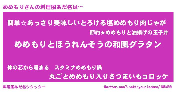 | 男性向けラノベタイトル風あだ名 | 『めめもり~年齢イコール彼女いない歴の魔法使い~』 |