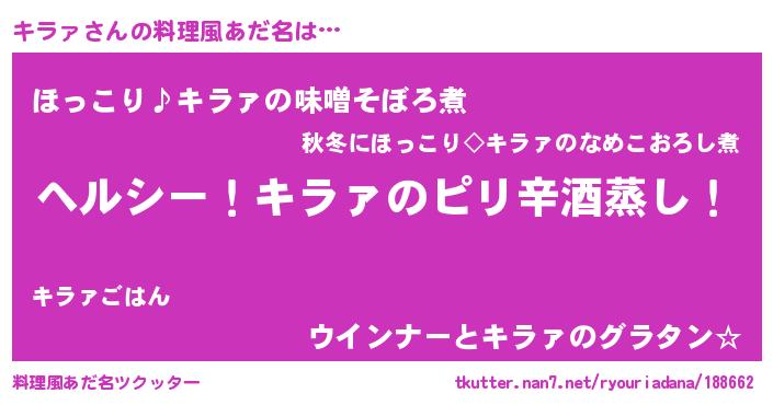 | 男性向けラノベタイトル風あだ名 | 『Re:キラァから始める異世界生活』 |