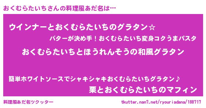 | 男性向けラノベタイトル風あだ名 | 『おくむらたいち~年齢イコール彼女いない歴の魔法使い~』 |