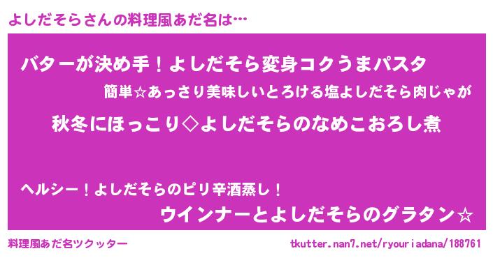 | 男性向けラノベタイトル風あだ名 | 『よしだそらに滅ぼされるだけの簡単なお仕事です』 |