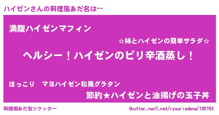 | 男性向けラノベタイトル風あだ名 | 『Re:ハイゼンから始める異世界生活』 |