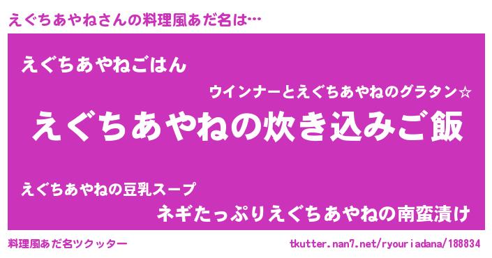 | 肩書あだ名 | 『えぐちあやね船長』『えぐちあやね大将』 |