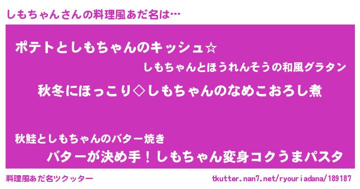 | 男性向けラノベタイトル風あだ名 | 『しもちゃんに滅ぼされるだけの簡単なお仕事です』 |