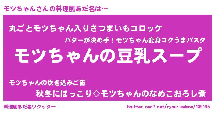 | 男性向けラノベタイトル風あだ名 | 『ダンジョンにモツちゃんを求めるのは間違っているだろうか』 |
