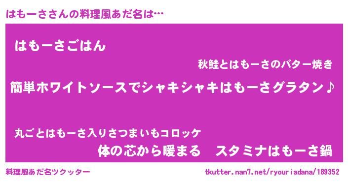 | 男性向けラノベタイトル風あだ名 | 『はもーさの嫁は女の子じゃないと思った?』 |