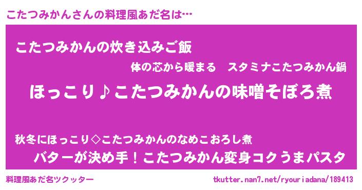 | 男性向けラノベタイトル風あだ名 | 『こたつみかんの憂鬱』 |